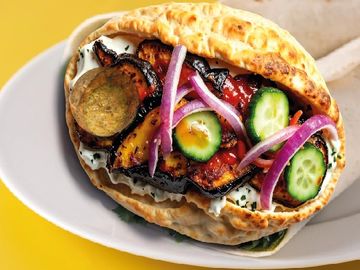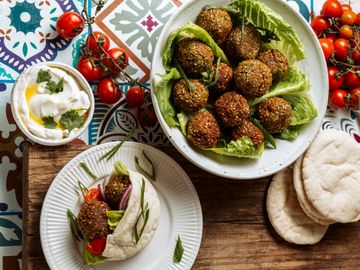 Falafel, Vegetables, Tahini, Pickles, Eggplant.