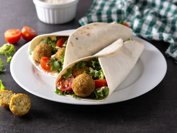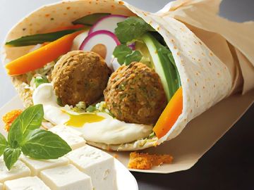 Falafel, Vegetables, Tahini, Feta Cheese.