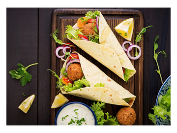 Falafel, Vegetables, Potatoes, Eggplant, Feta Cheese, Tahini.