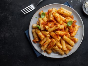 Makaron z sosem pomidorowym i smażone warzywa
